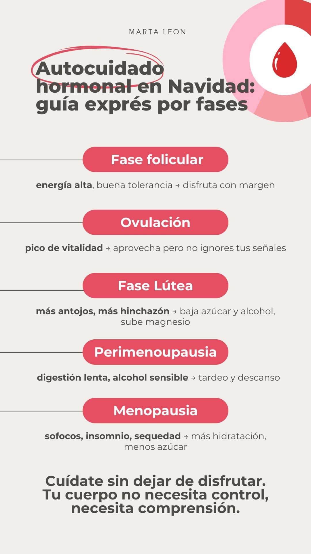 Y si a eso le sumamos el contexto navideño —comidas copiosas, bebidas, estrés, trasnoches, compromisos— entonces la fase del ciclo en la que estés puede marcar una diferencia enorme.