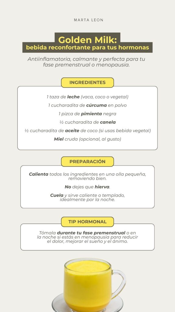 Las infusiones con efecto antiinflamatorio pueden ser un buen apoyo. El jengibre es una opción habitual para aliviar molestias asociadas al ciclo. La cúrcuma, tomada en forma de curcuma latte y acompañada de pimienta negra y una grasa, también ayuda a modular la inflamación.