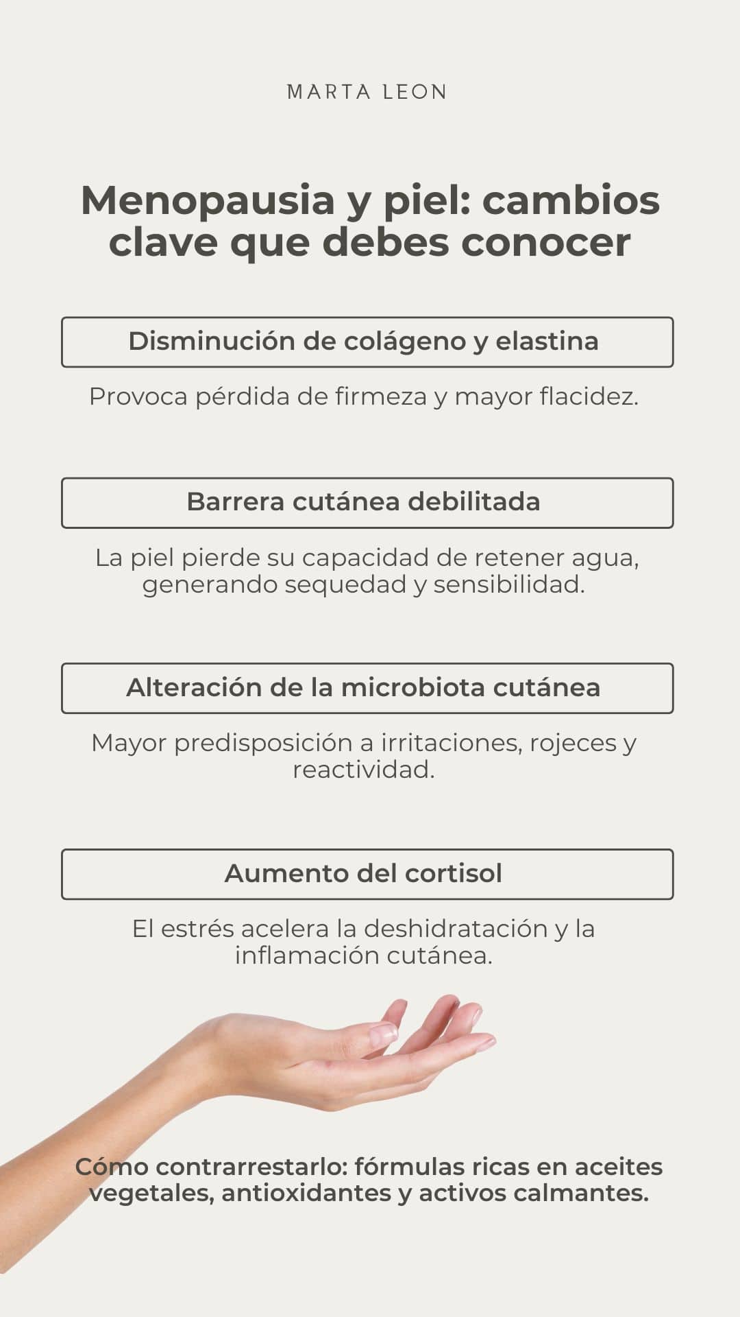 Durante la perimenopausia y la menopausia, el cuerpo atraviesa una serie de cambios que afectan no solo a nuestro equilibrio hormonal, sino también a nuestra piel. Con la disminución de estrógenos, es común notar una mayor sequedad, pérdida de elasticidad y sensibilidad cutánea. Adaptar la rutina de cuidado de la piel a esta nueva etapa es clave para mantenerla sana, nutrida y confortable.