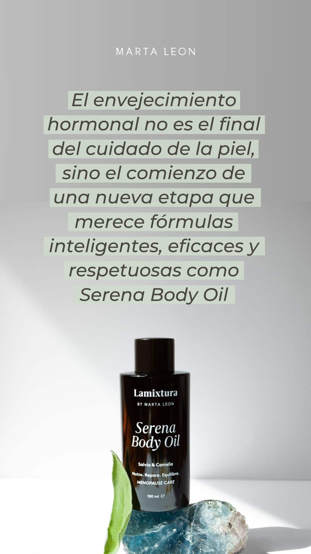 Una solución efectiva para contrarrestar estos efectos es el uso de tratamientos naturales que realmente nutran y protejan la piel es Serena Body Oil, un óleo elixir ultra hidratante que he formulado junto a Amaia y Silvia, las fundadoras de Lamixtura, con ingredientes naturales, sin disruptores endocrinos y específicamente diseñado para cuidar tu piel en perimenopausia y menopausia, devolviéndole el confort, la elasticidad y el bienestar.