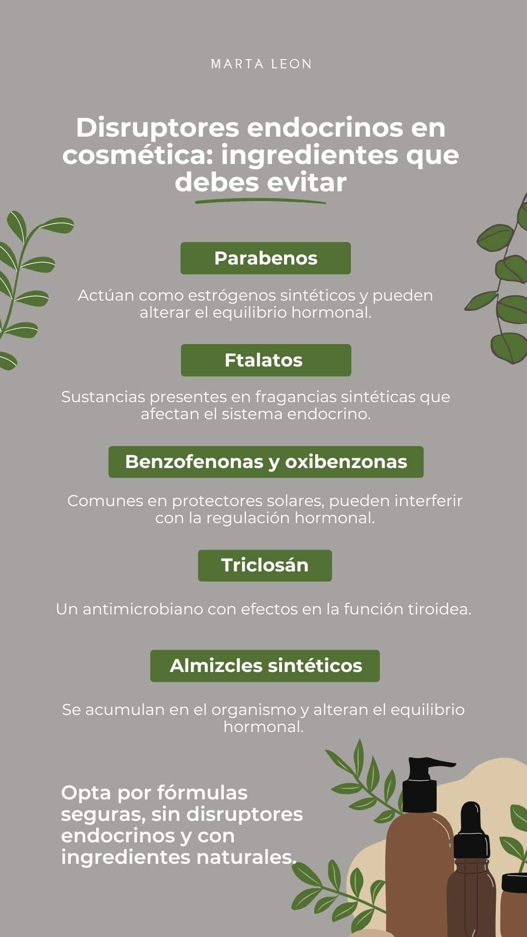 - Parabenos: Utilizados como conservantes, pueden actuar como estrógenos sintéticos en el organismo.