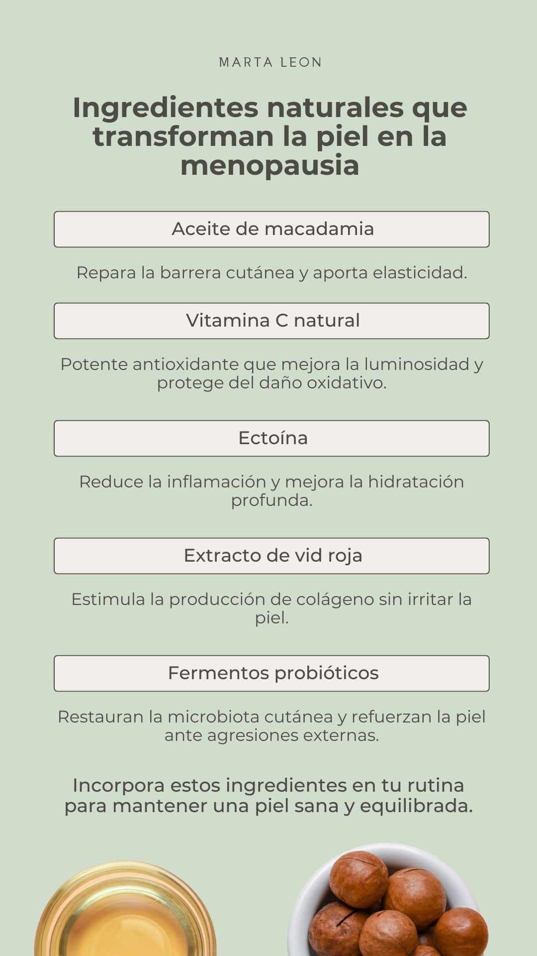 Aunque el retinol es un ingrediente popular en el cuidado de la piel, no siempre es la mejor opción para pieles sensibles o en etapas de cambios hormonales. Ingredientes naturales como el aceite de semillas de maracuyá, los extractos botánicos redensificantes como la centella asiática o la vid roja, ofrecen beneficios similares sin causar irritación.