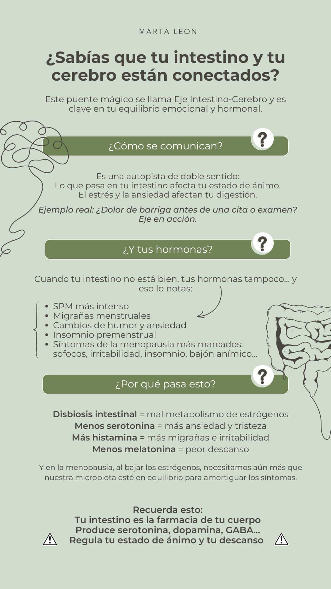 Cuando nuestra digestión no va bien, lo sentimos en todo nuestro cuerpo. No solo es hinchazón o malestar abdominal, es que emocionalmente también estamos más vulnerables. Aparece la irritabilidad, la tristeza se hace más densa y los cambios de humor nos sacuden con más fuerza. Y si estás en fase premenstrual o estás transitando al climaterio… todo se intensifica. Porque un intestino desequilibrado, también altera la química de tu cerebro y desequilibra tus hormonas, haciendo que esos días antes de la regla sean mucho más difíciles de llevar.