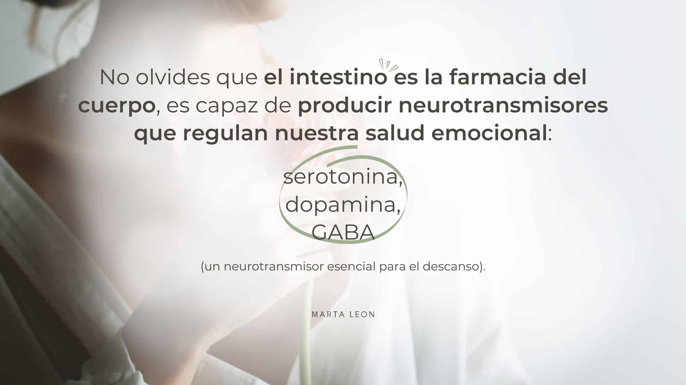 No olvides que el intestino es la farmacia del cuerpo, es capaz de producir neurotransmisores que regulan nuestra salud emocional: serotonina, dopamina, GABA (un neurotransmisor esencial para el descanso).
