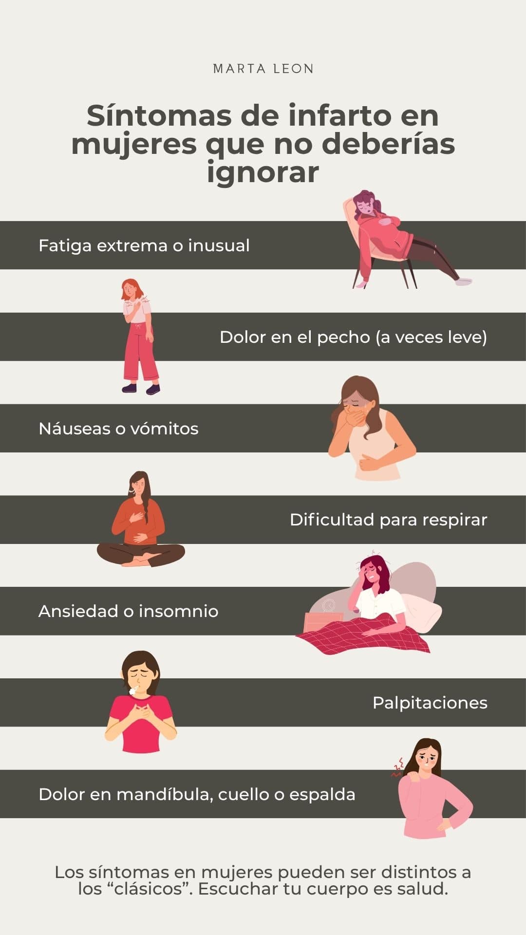 En mujeres, el inicio de un infarto puede ser más progresivo y menos dramático que en hombres. Muchas veces comienza con una sensación de: