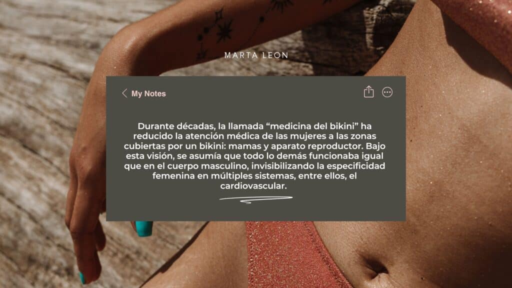 Durante décadas, la llamada “medicina del bikini” ha reducido la atención médica de las mujeres a las zonas cubiertas por un bikini: mamas y aparato reproductor. Bajo esta visión, se asumía que todo lo demás funcionaba igual que en el cuerpo masculino, invisibilizando la especificidad femenina en múltiples sistemas, entre ellos, el cardiovascular. Este enfoque limitado ha contribuido a que se desconozcan los síntomas particulares del infarto en mujeres, y a que su diagnóstico llegue tarde, cuando ya es urgente actuar.