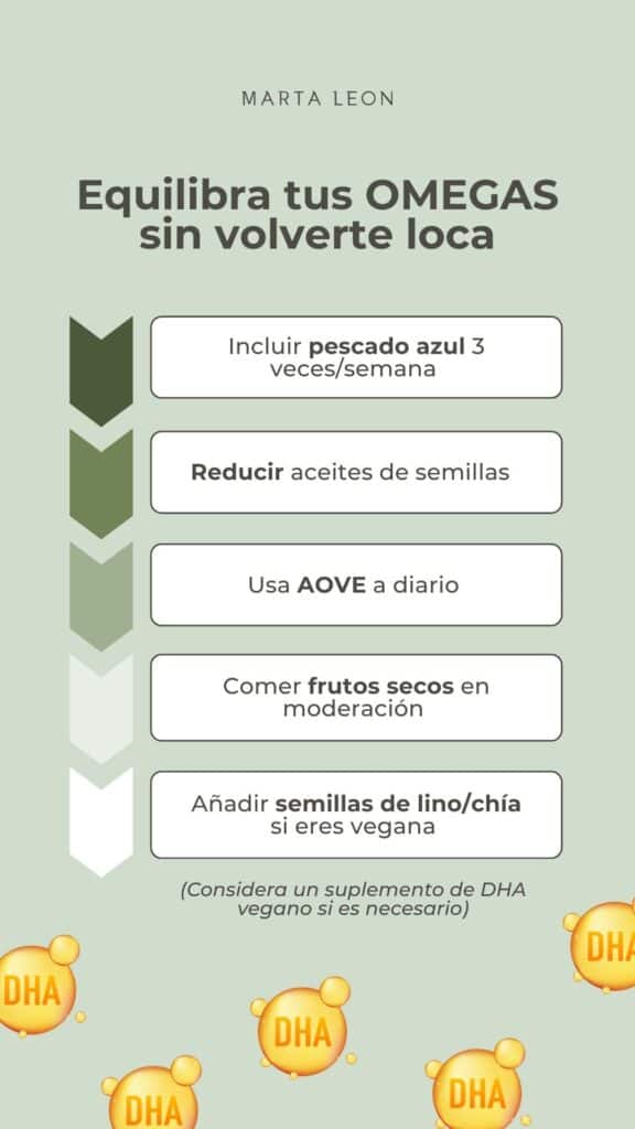 Aquí es importante aclarar algo clave: la conversión del ALA en DHA es limitada, por lo que, si llevas una alimentación vegetariana estricta, (y tienes algún problema hormonal o inflamatorio), tal vez debas considerar suplementarte con DHA vegano. Eso sí, pregúntale a tu profesional sanitario de confianza para quedarte más tranquila.