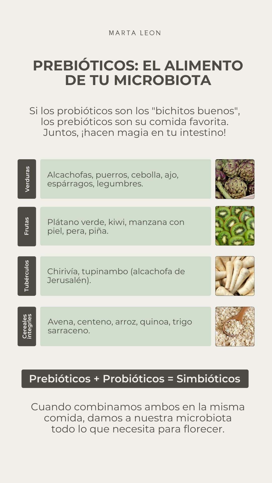 Si te fijas, son alimentos que también forman parte de la dieta mediterránea. Y aquí es donde podemos hacer magia, porque cuando combinamos probióticos + prebióticos en la misma comida, estamos creando alimentos simbióticos naturales.