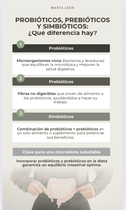 • Simbióticos → Es la combinación de probióticos + prebióticos en un solo alimento o suplemento. Es decir, es como darle a tu microbiota todo lo que necesita en un solo paso.