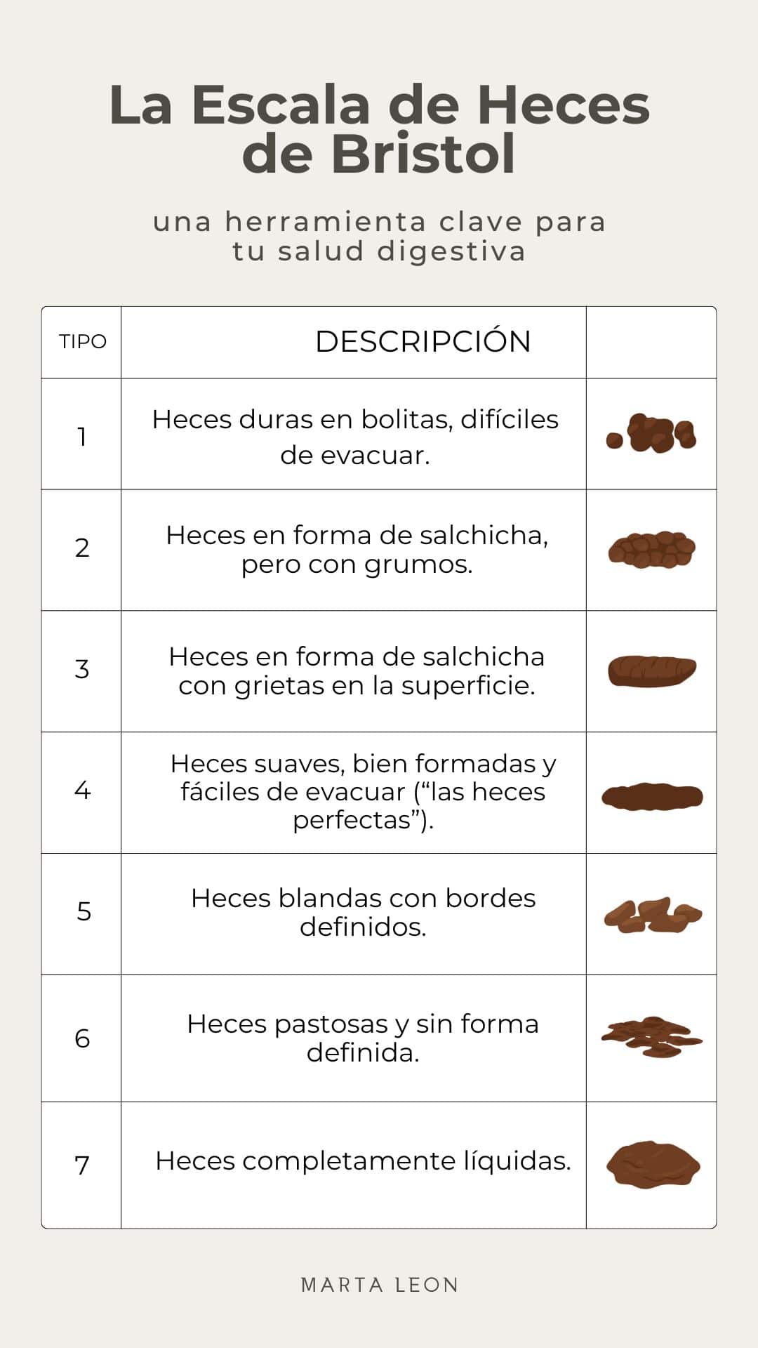 Es una herramienta muy visual que clasifica la forma de las heces en siete tipos, desde bolitas duras hasta heces líquidas. Las más deseables son el tipo 3 y 4, suaves, bien formadas y fáciles de evacuar. Puedes encontrarla fácilmente en internet y tenerla a mano como una guía para ir interpretando tus señales digestivas.