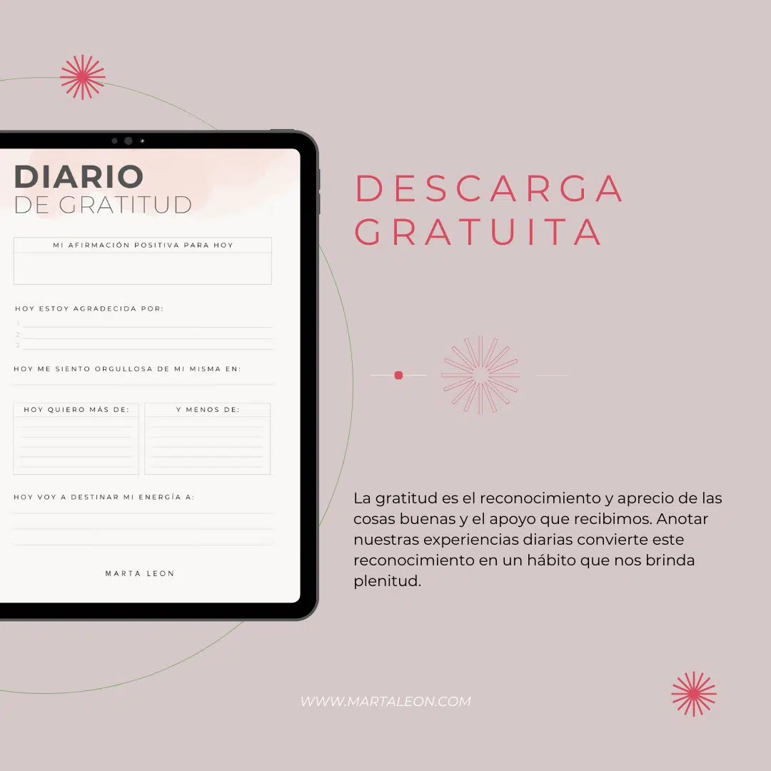 Dedica unos minutos cada mañana o cada noche, a reflexionar sobre las cosas de tu vida por las que te sientes agradecida es un hábito sencillo y al mismo tiempo muy poderoso. Al escribir esas palabras de gratitud, te das el permiso para detenerte y reconocer el valor de las experiencias y de las personas que hacen que tu vida sea especial. No importa que si son grandes logros o momentos cotidianos: cada pequelo detalle que agradeces contribuyes a construir un estado emocional más equilibrado, que atraerá más alegría, abundancia y satisfacción a tu vida.